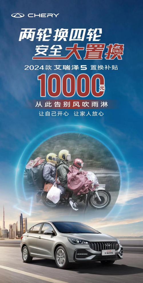 我们常说摩托车代表风与自由,但对于在严寒暴雪中返乡的摩托车大军而言,更多的是一种“无奈”。即便你不是返乡摩托大军中的一员,但家里摩托车常年“躺平”、放着落灰,你是否有用之不及,弃之可惜的感慨。所以,从没车到有车,是一种生活方式的转变。从有车到换车,是一种生活品味的转变。你是时候用两轮的它,“换”一种新生活了。2024款艾瑞泽5既能为你遮风挡雨,又能让你冬暖夏凉,堪称日常出行的最佳伙伴。更何况现在置换可享受10000元补贴,不要再犹豫不决了,赶紧参与2024款艾瑞泽5两轮换四轮安全大置换活动,将心仪好车开回家吧。