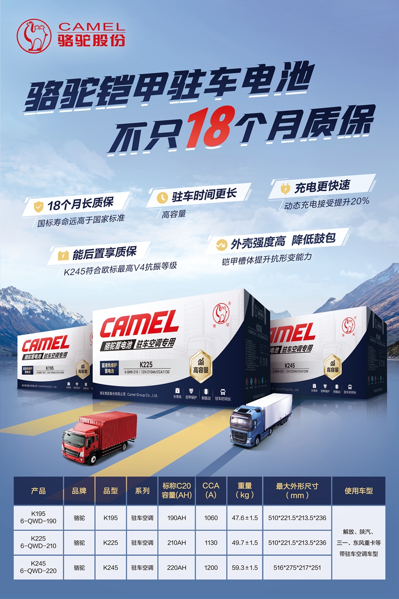骆驼蓄电池深耕蓄电池行业40多年,对铠甲驻车空调电池产品在驻车时长、充电速度、耐振动、抗形变、寿命长的五大性能上全新升级,可适配一汽解放、陕汽重卡、东风重卡等知名品牌旗下车型,轻松满足汽车用电要求,K系列骆驼铠甲驻车空调蓄电池的质保也升级到了18个月的水平,让用户使用安心无忧。面对即将到来的夏季,常年在路上的卡友们不妨尝试换上一对骆驼铠甲驻车空调蓄电池,为高温酷暑做好准备。