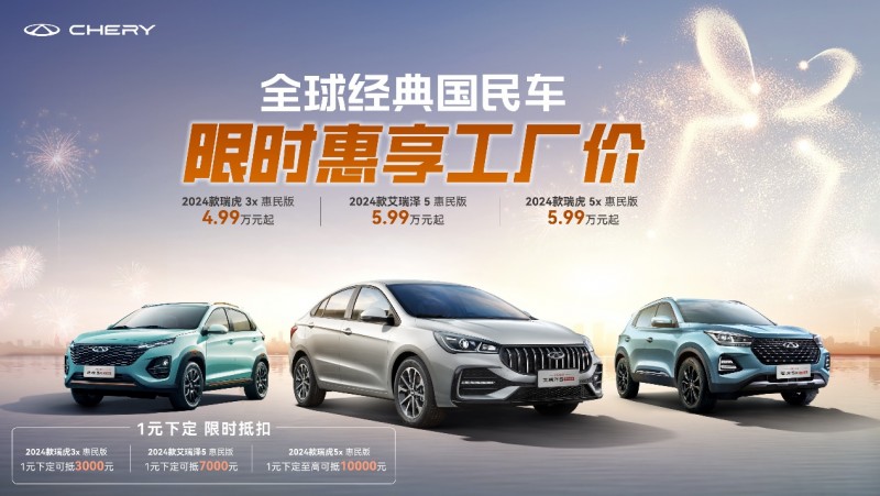 2024款瑞虎3x/瑞虎5x/艾瑞泽5惠民版上市,限时享1元下定至高抵1万元