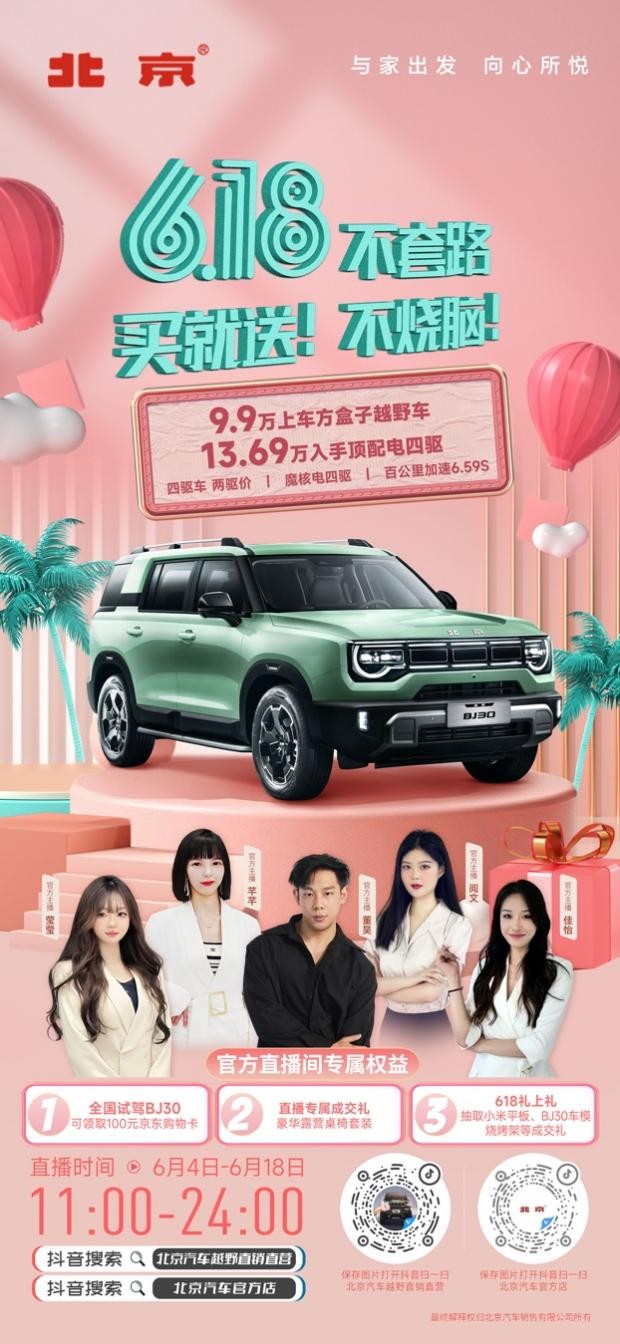 为了让更多用户享受到BJ30的福利,北京汽车还在官方直播间推出直播优惠,6月18日直播当天,北京汽车送出全国试驾BJ30可领取100元京东购物卡、直播专属成交礼豪华露营桌椅套装、618礼上礼抽取小米平板、BJ30车模烧烤架等成交礼。