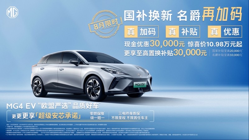 “国补”客户至高优惠60000元 MG4 EV低至7万元起