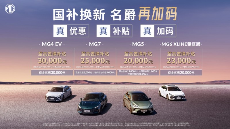 近日,国家发展改革委、财政部发布了《关于加力支持大规模设备更新和消费品以旧换新的若干措施》,上汽MG名爵积极响应这一号召,在“国补”基础上进一步加大了置换补贴力度。相较其他品牌的置换政策而言,上汽MG名爵此次的补贴可谓诚意满满。即日起至8月31日,凡是符合“国补”条件的消费者购置MG4 EV可额外享受10000元厂商置换补贴;MG7、MG5、MG6 XLINE猎鲨版以及MG ONE等车型同样具备不同的优惠政策,并且均可享受至高10000元厂商置换补贴,有意购车的朋友赶快行动起来!