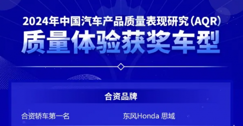 近日,2024年中国汽车产品质量表现研究(AQR)结果发布暨颁奖典礼在北京成功举办,主办方公布了整车各细分市场质量体验最佳车型,东风Honda思域摘得“2024合资轿车质量体验奖”桂冠!